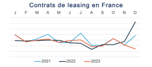 Malheureusement, le mois de décembre a enregistré un recul de 77 % par rapport à 2022 entrainant ainsi une baisse globale pour le trimestre de 39 %. Sur l’ensemble de l’année, et grâce aux bons résultats du premier semestre, le financement d’actifs en 2023 a été similaire à celle de 2022, avec un recul inférieur à 1 point. Cependant, si l’on compare à 2021, le volume global en valeur du leasing est de -10%.